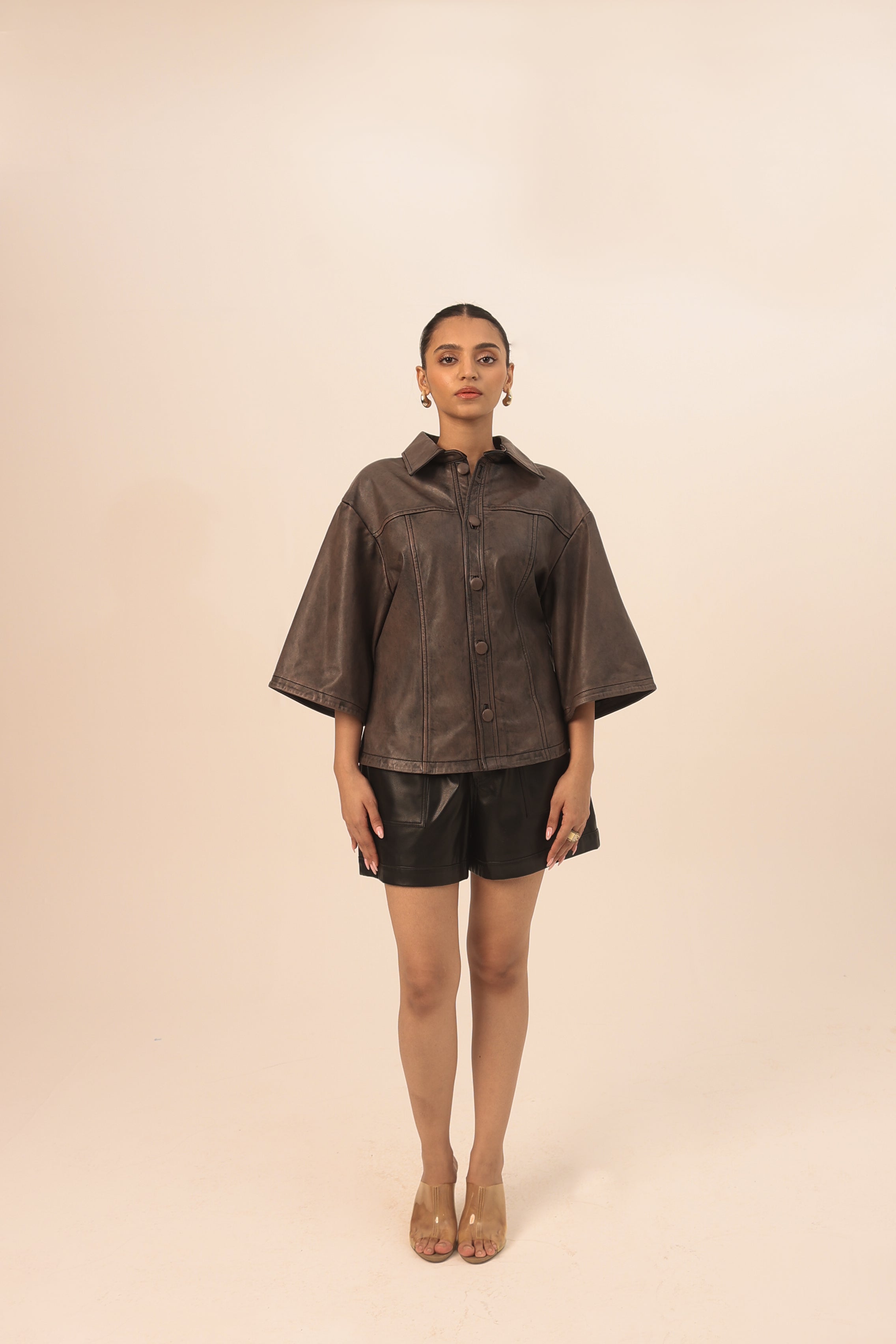 Crafted from genuine lambskin, the Arabica Leather Shirt is a statement in structure and sophistication. Designed with a contoured fit at the waist, it features a rich, two-toned washed brown finish, luxe leather buttons and flared half sleeves for a modern, sculptural silhouette. Versatile enough to wear as a shirt or light jacket—this piece brings effortless style to both day and night dressing.