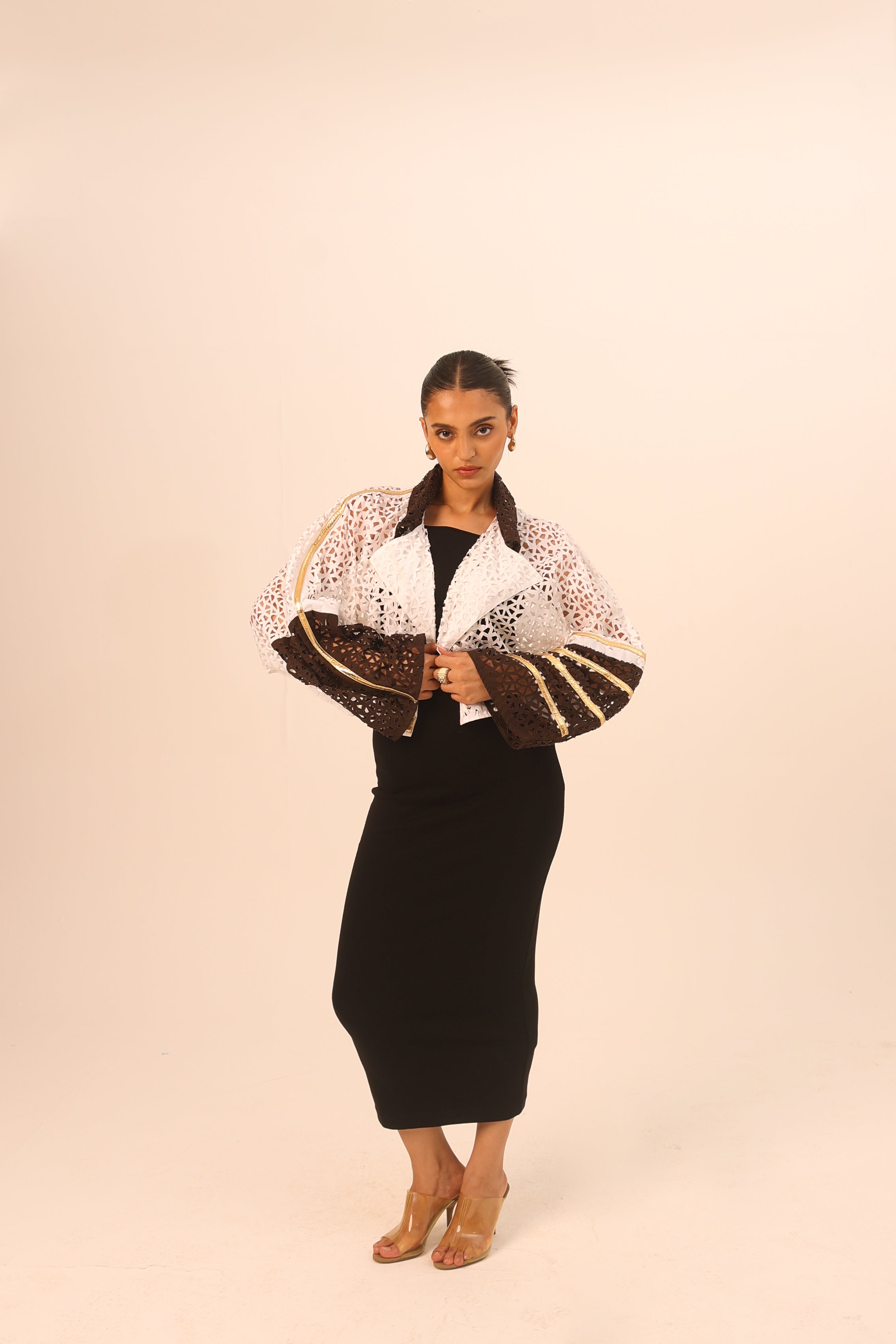 A sculptural silhouette meets intricate surface work in the Ivory Quartz Shacket. Crafted in precision-cut cotton with geometric laserwork, this cropped layer merges airy texture with structure. Accented by genuine gold leather detailing on rich cocoa sleeves.