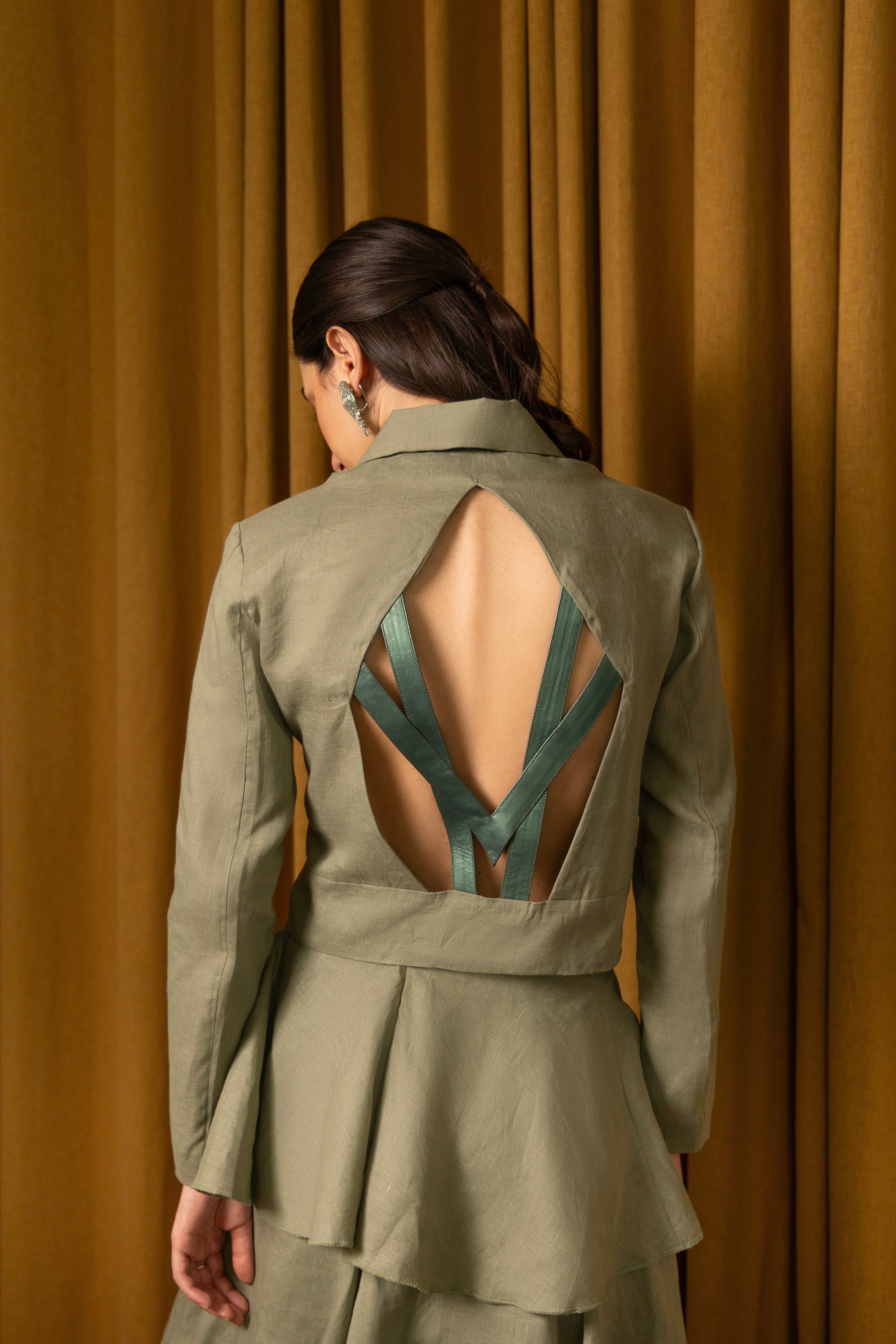 Make a statement in green linen with this eye-catching co-ord set. Featuring a cropped double-breasted blazer adorned with green metallic leather pocket flaps, paired with a frill skirt embellished with a matching green metallic leather bow on the left waist side.