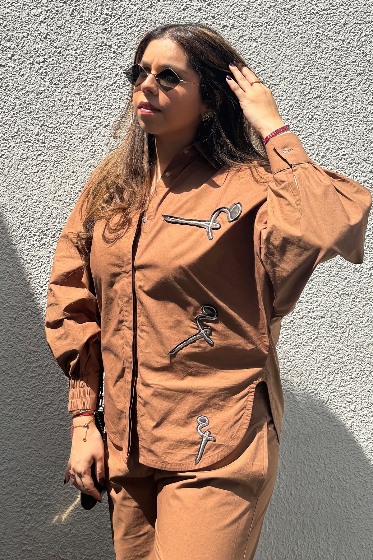 Crafted in a charming cotton light brown color, this set exudes effortless style and comfort. The free sized shirt features TLT logo embroidered appliqués on lambskin leather, elastic on the wrists for added versatility, while the elastic waist pants offer a comfortable fit. Complete with TLT logo embroidered appliqués on lambskin around the hemline and two functional pockets, this set embodies the essence of laid-back luxury and timeless sophistication.