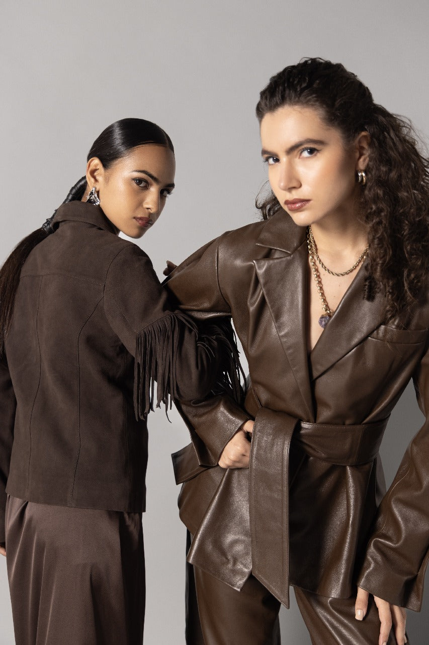 Crafted from genuine dark brown suede, this jacket redefines timeless style with a modern edge. Featuring fringed sleeves, buttoned closure, and a flattering fitted cut, it captures both movement and sophistication.