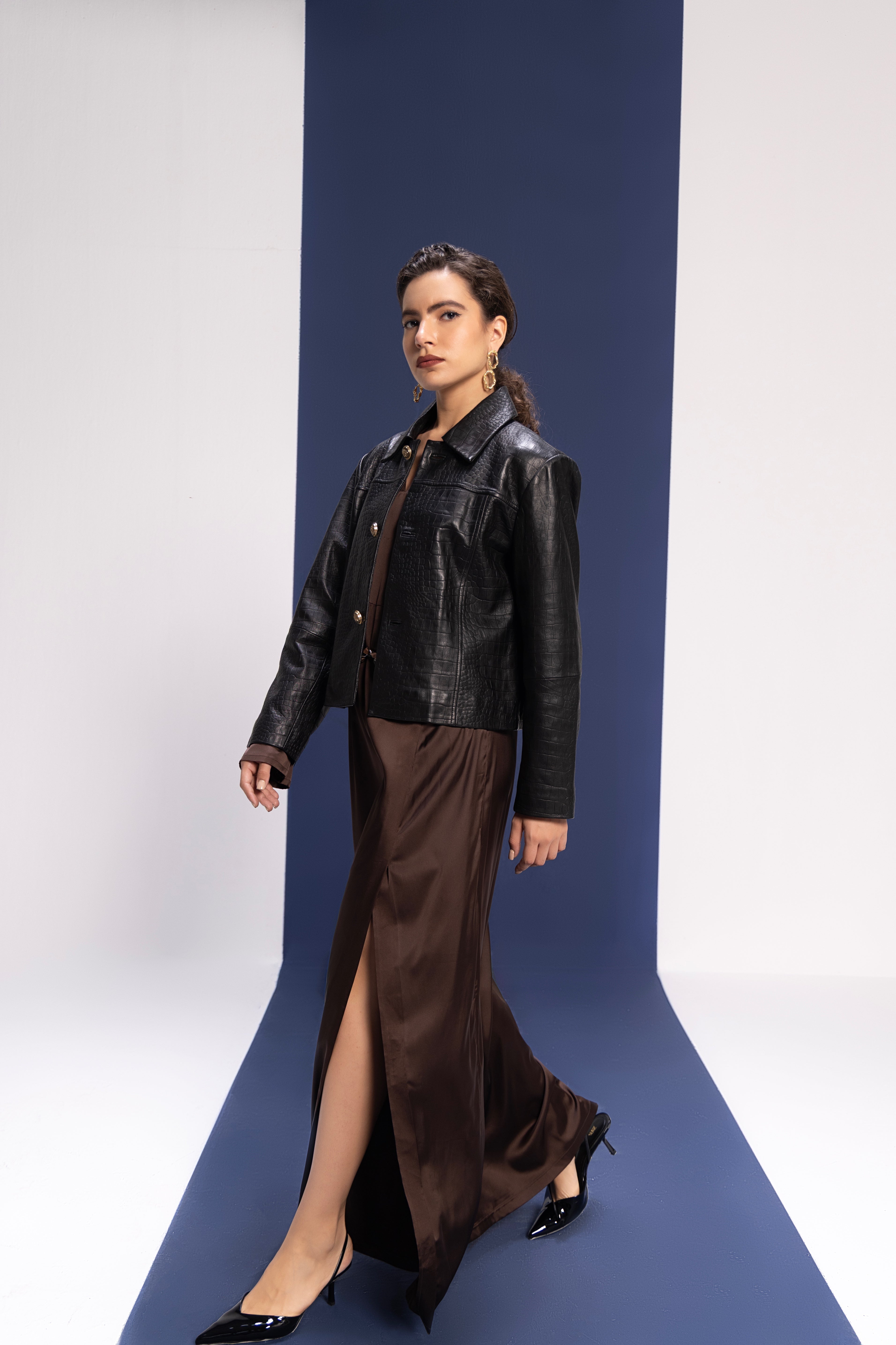Crafted from croc-embossed lambskin, this cropped jacket blends bold texture with elegance. Accented with gold buttons, it delivers a statement of refined power and timeless allure.