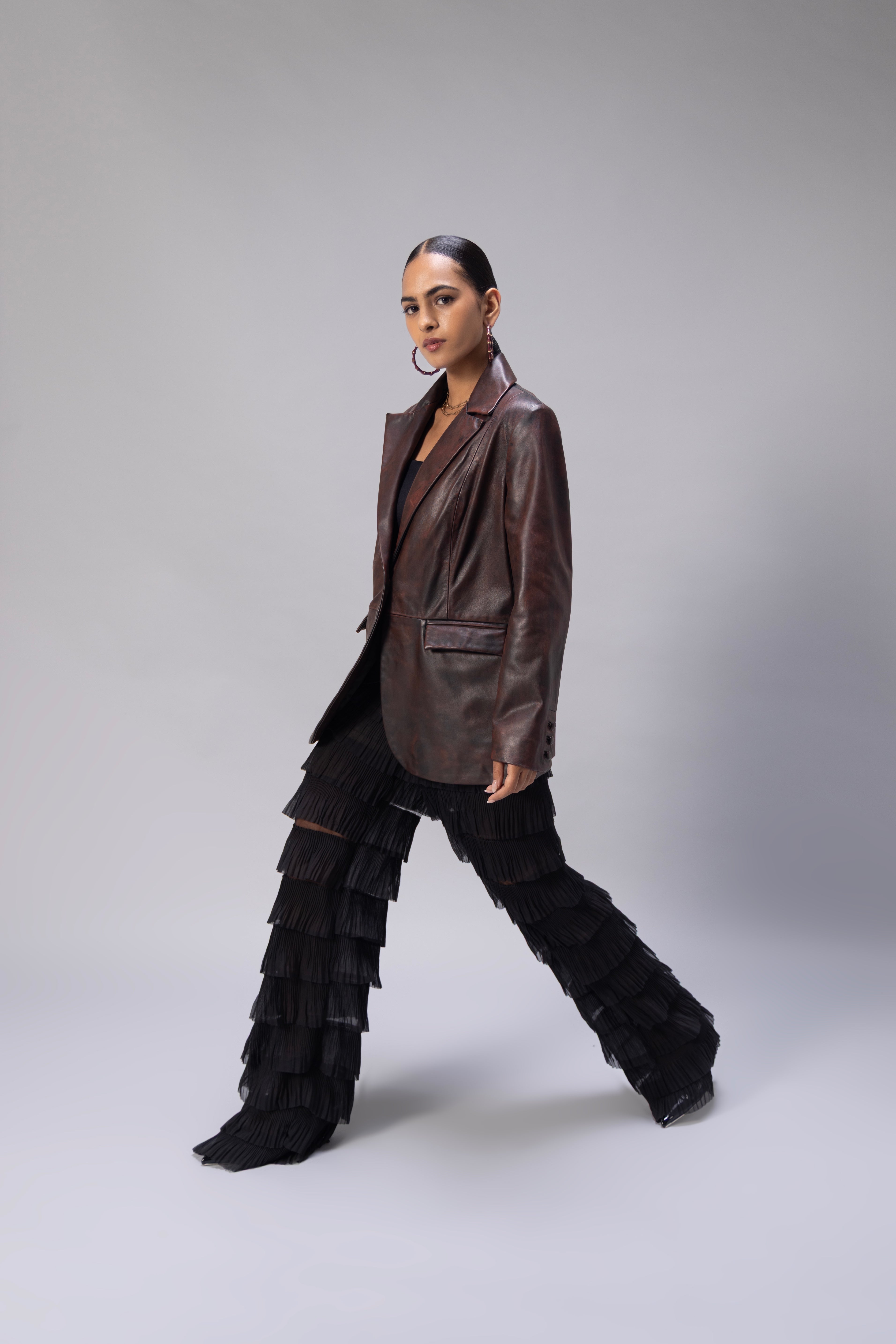 The Sovrana Leather Blazer embodies modern opulence with its two-toned red finish and sleek silhouette. Double-breasted with functional pockets, it’s a refined statement of power and poise.