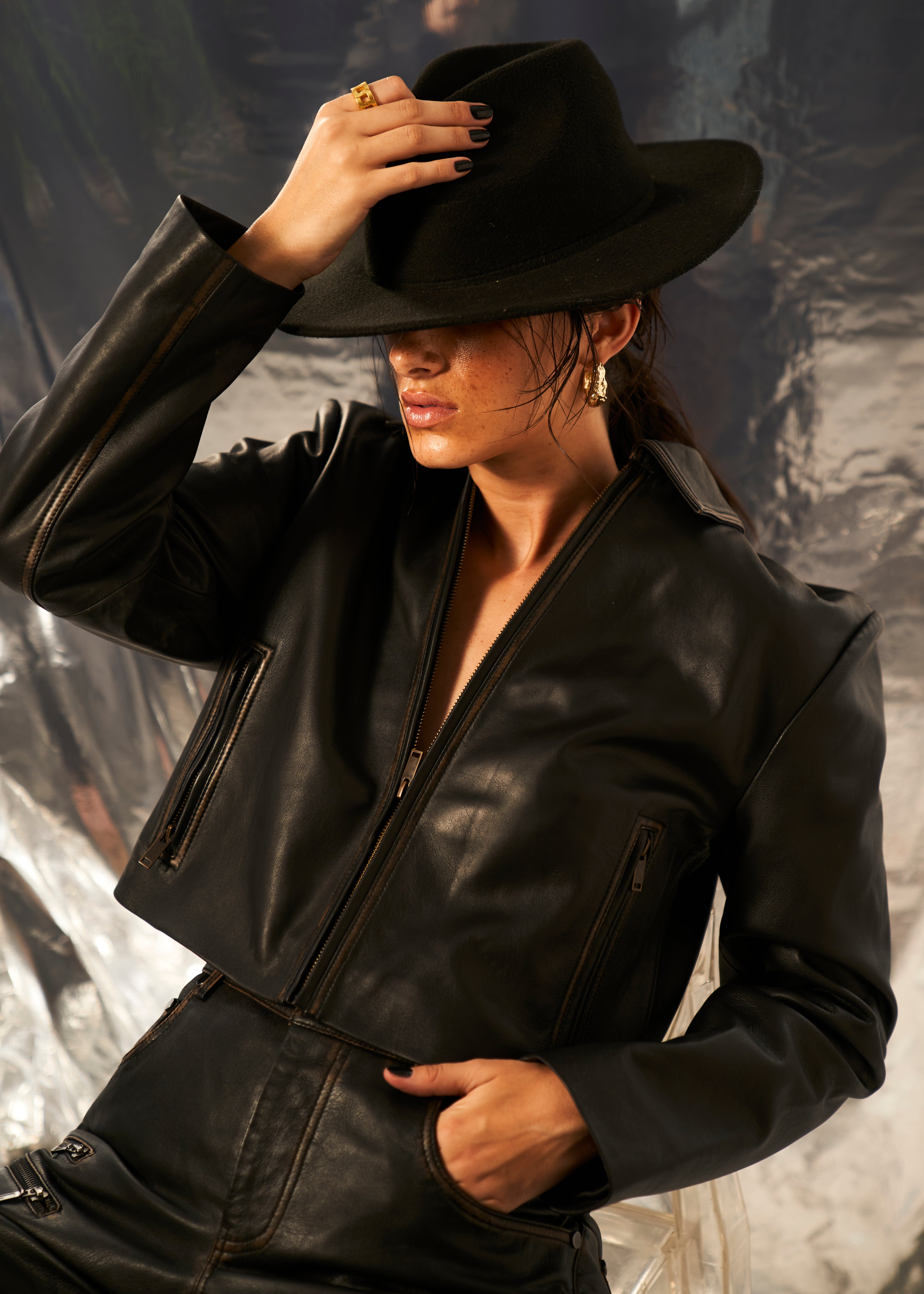 A sleek and daring piece. Crafted from lamb rub-off leather in classic black, this jacket features rub-off detailing around seam lines for added edge. The cropped design, coupled with two side zipper pockets, creates a modern and sophisticated look.