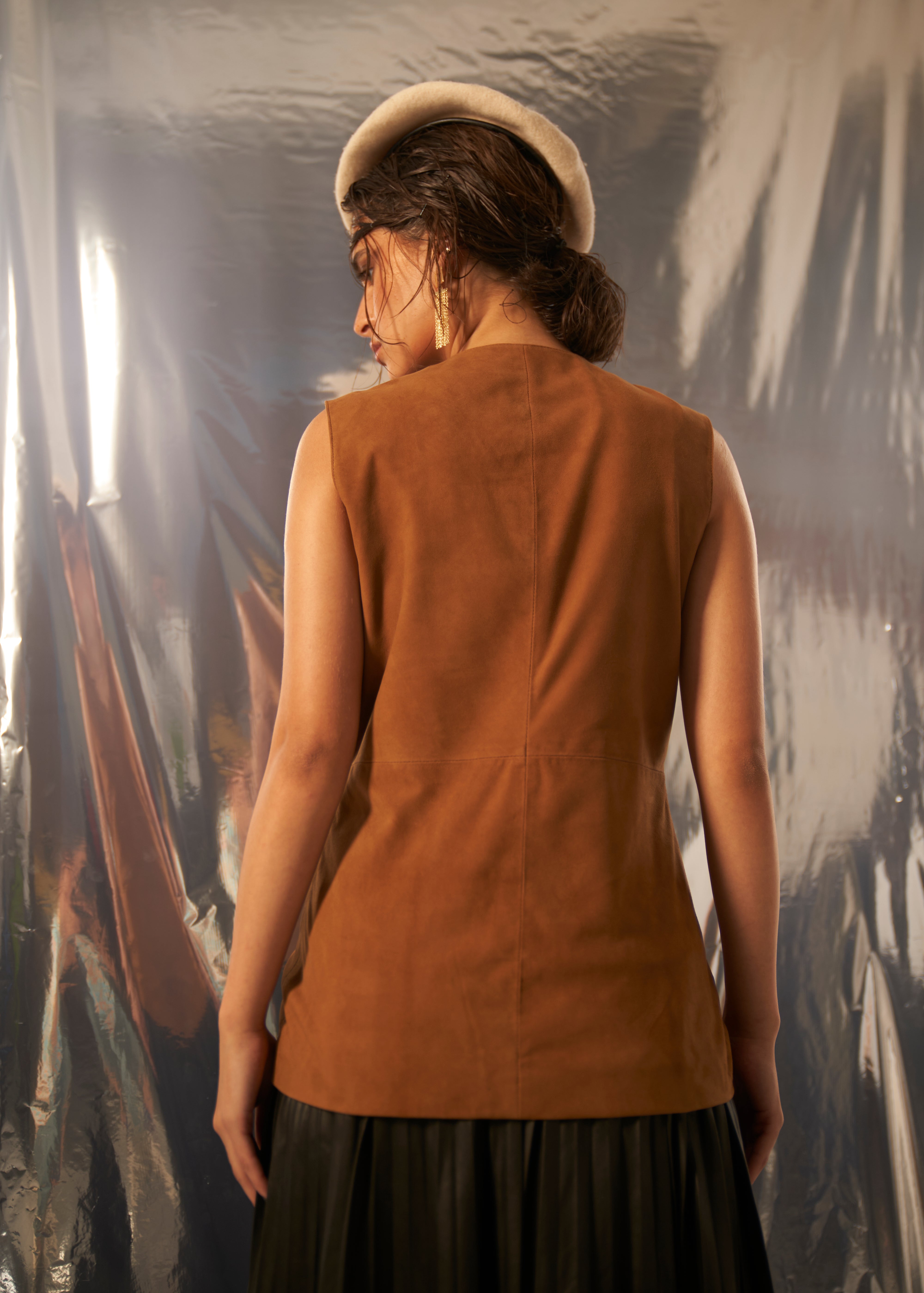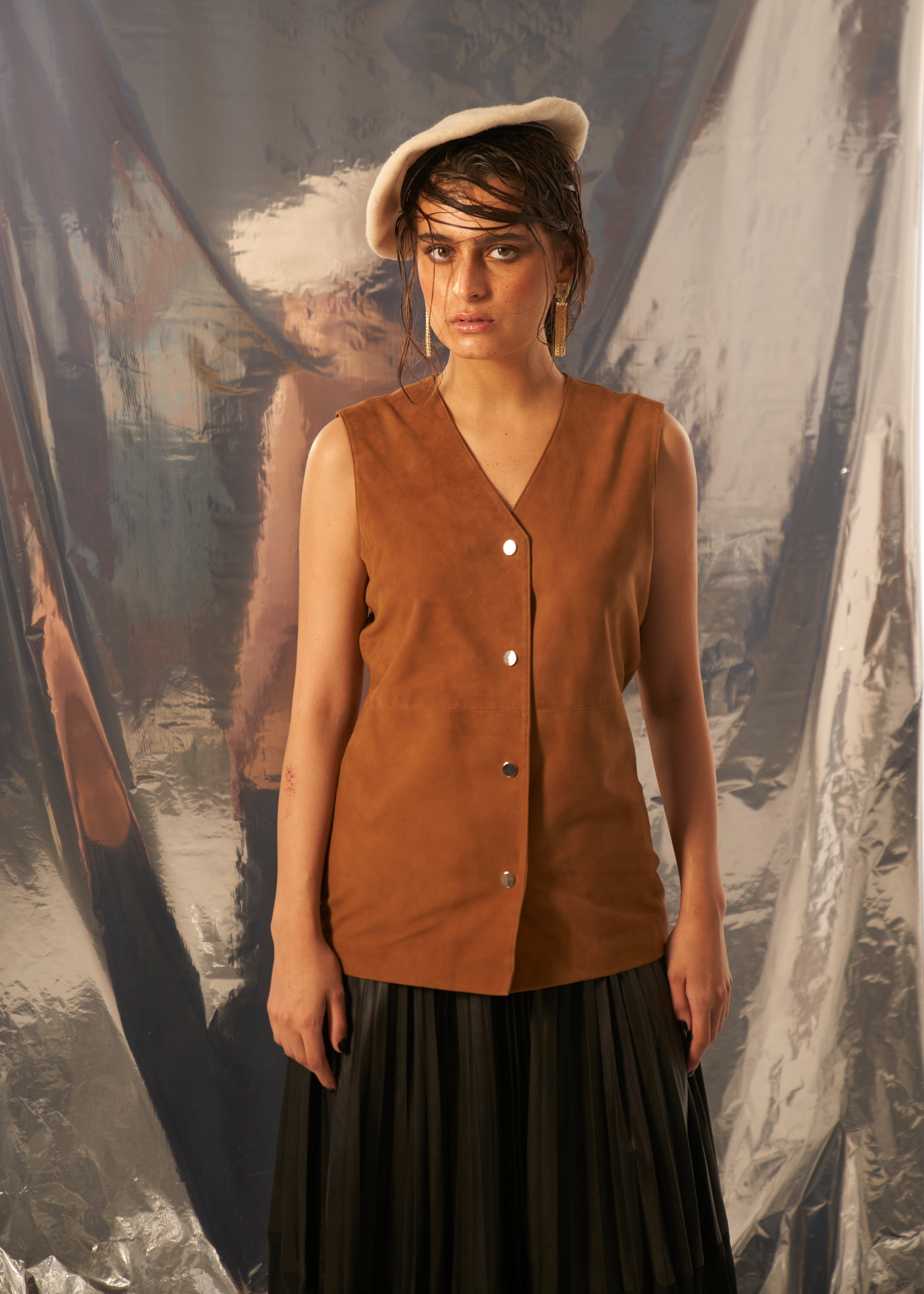 A chic and sophisticated piece in hazel brown - suede lambskin leather. This sleeveless blouse features a silver snap button front closure, adding a touch of modern elegance. With its luxurious material and timeless design, the Hazel Suede Blouse effortlessly elevates your style.