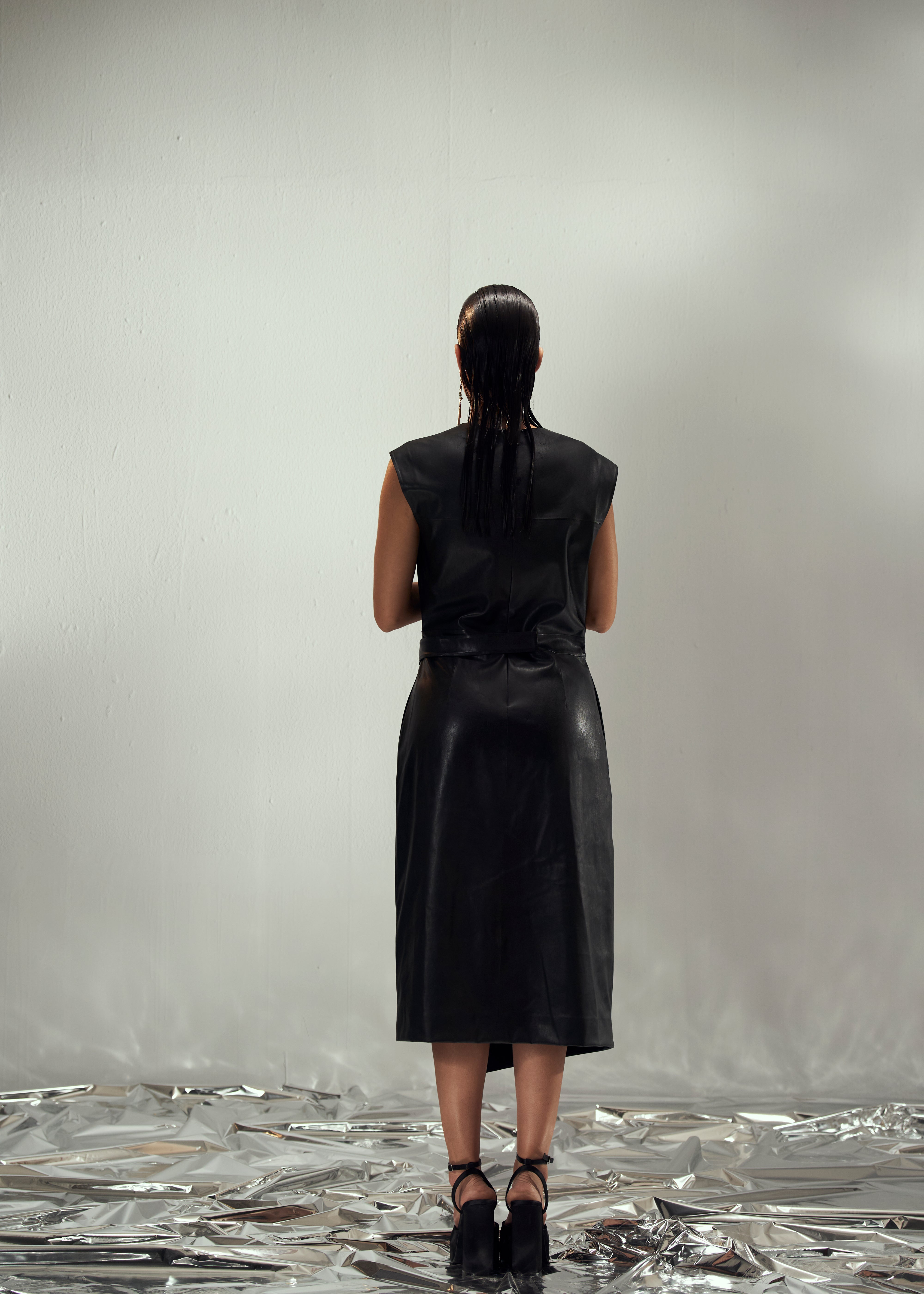 A black leather masterpiece with a unique neckline, waist-cinching twist belt, and a chic asymmetrical overlap panel. Below-knee length and half sleeves strike a perfect balance of classic and modern. Elevate your style effortlessly with this timeless ensemble.