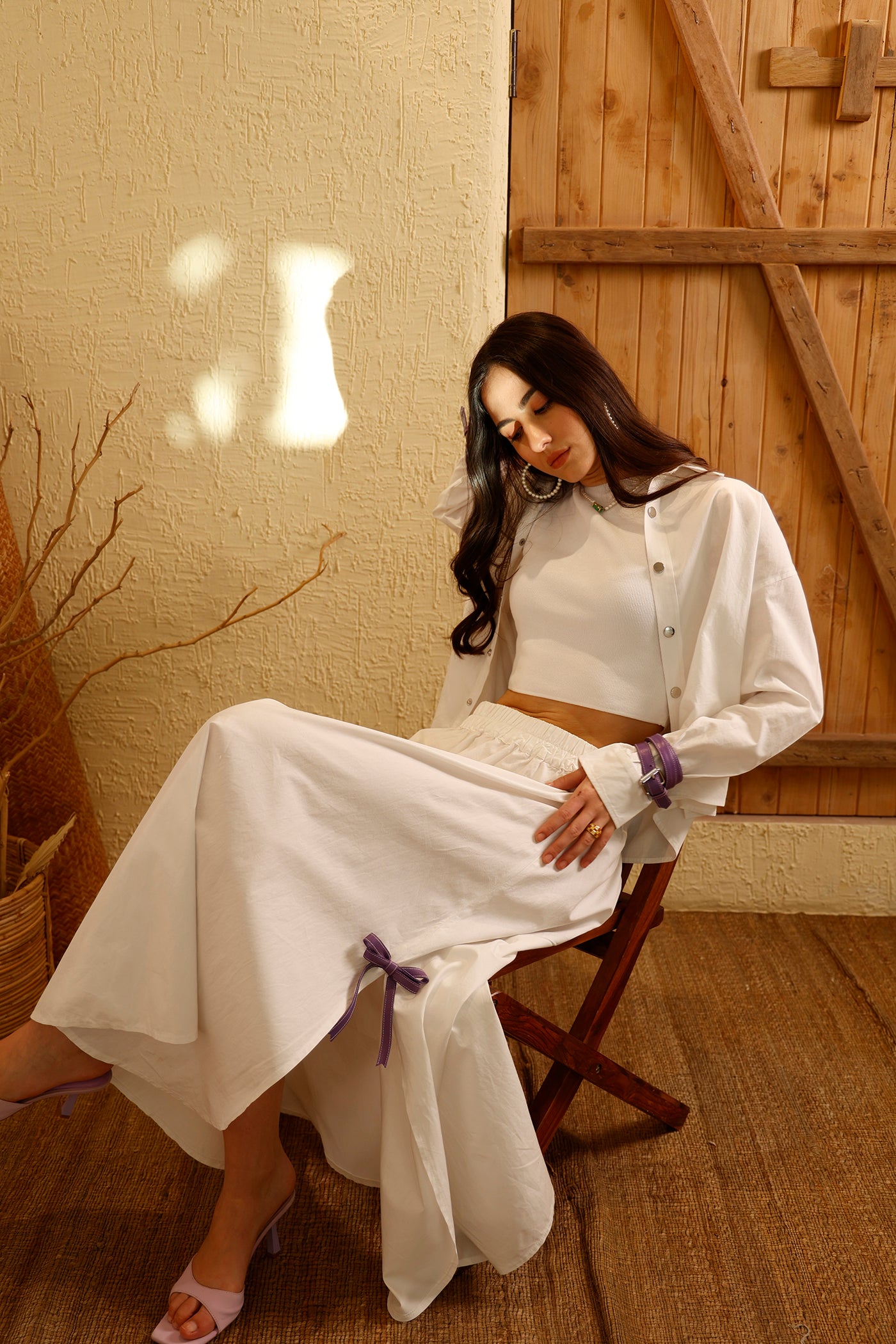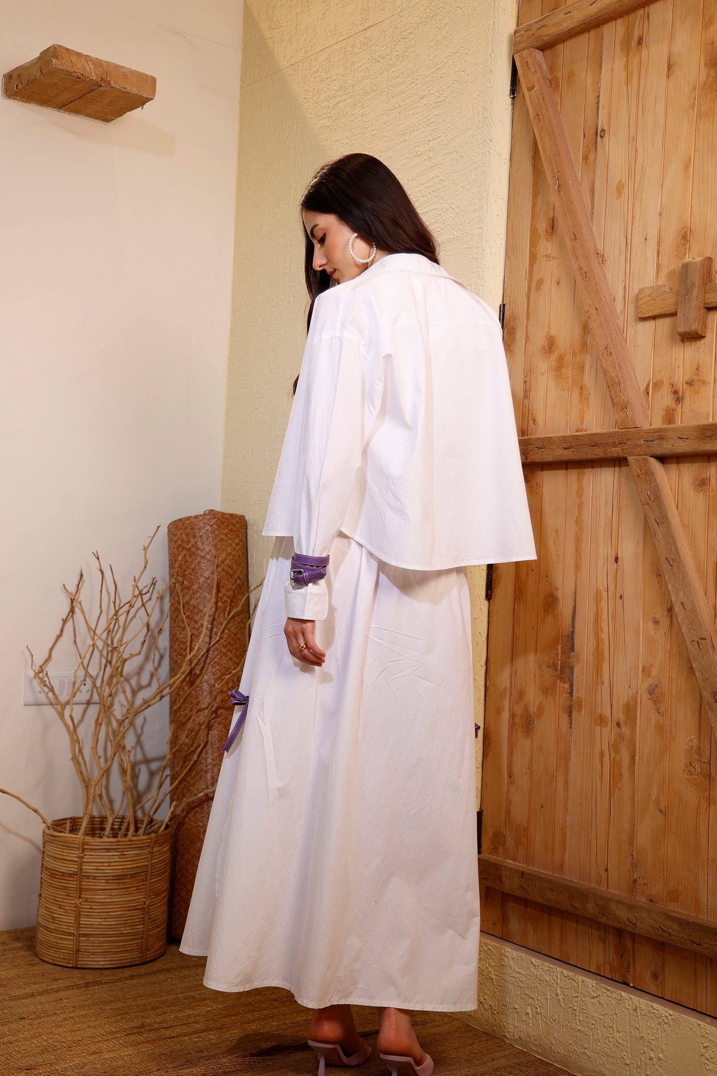 A co-ord set of your dreams. Full-sleeve shirt with snap button closure, adorned with detachable purple leather belts at the wrist. Paired with a long skirt featuring side slits and adjustable elastic waist, complete with detachable leather bows for added flair.