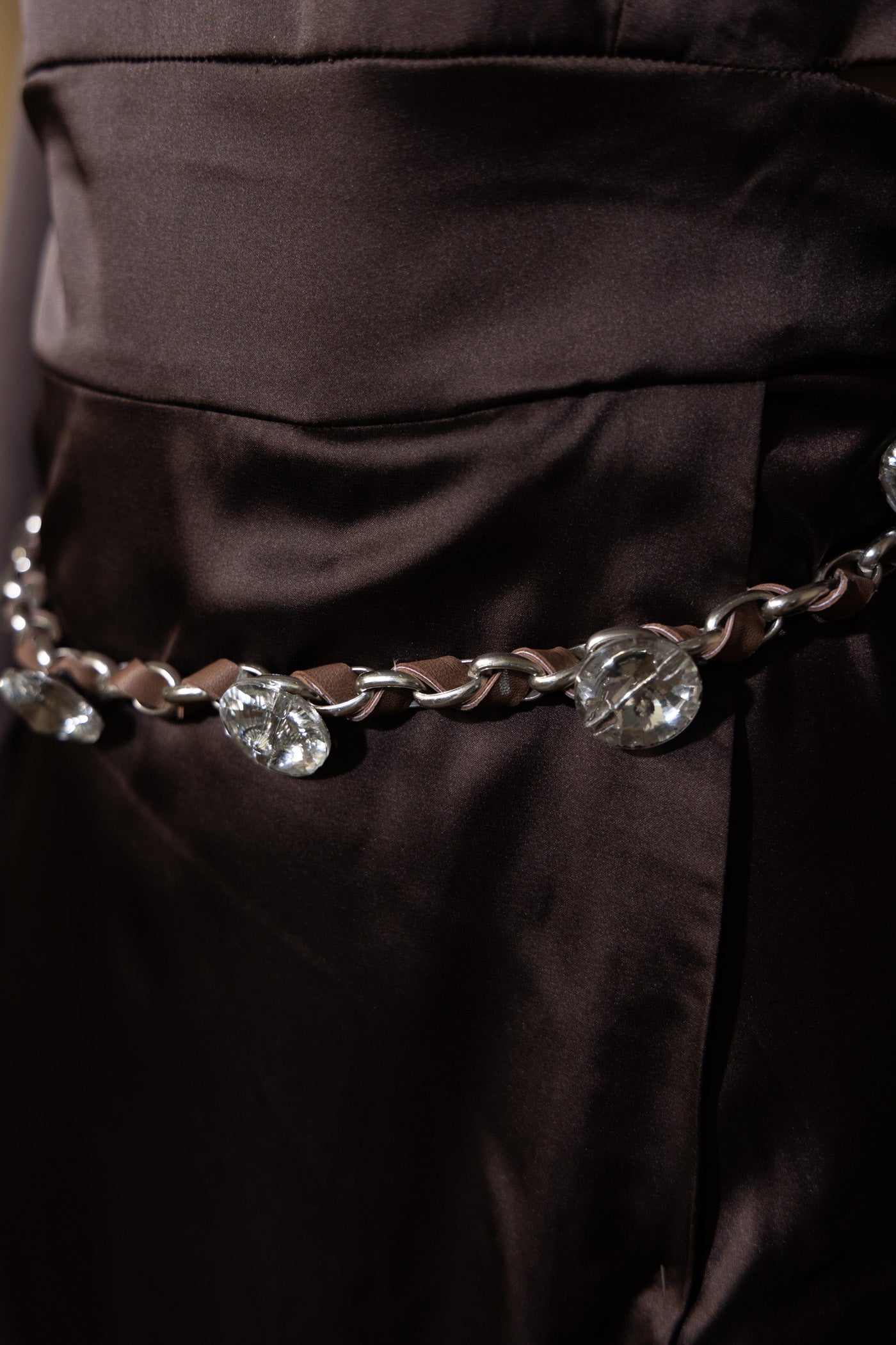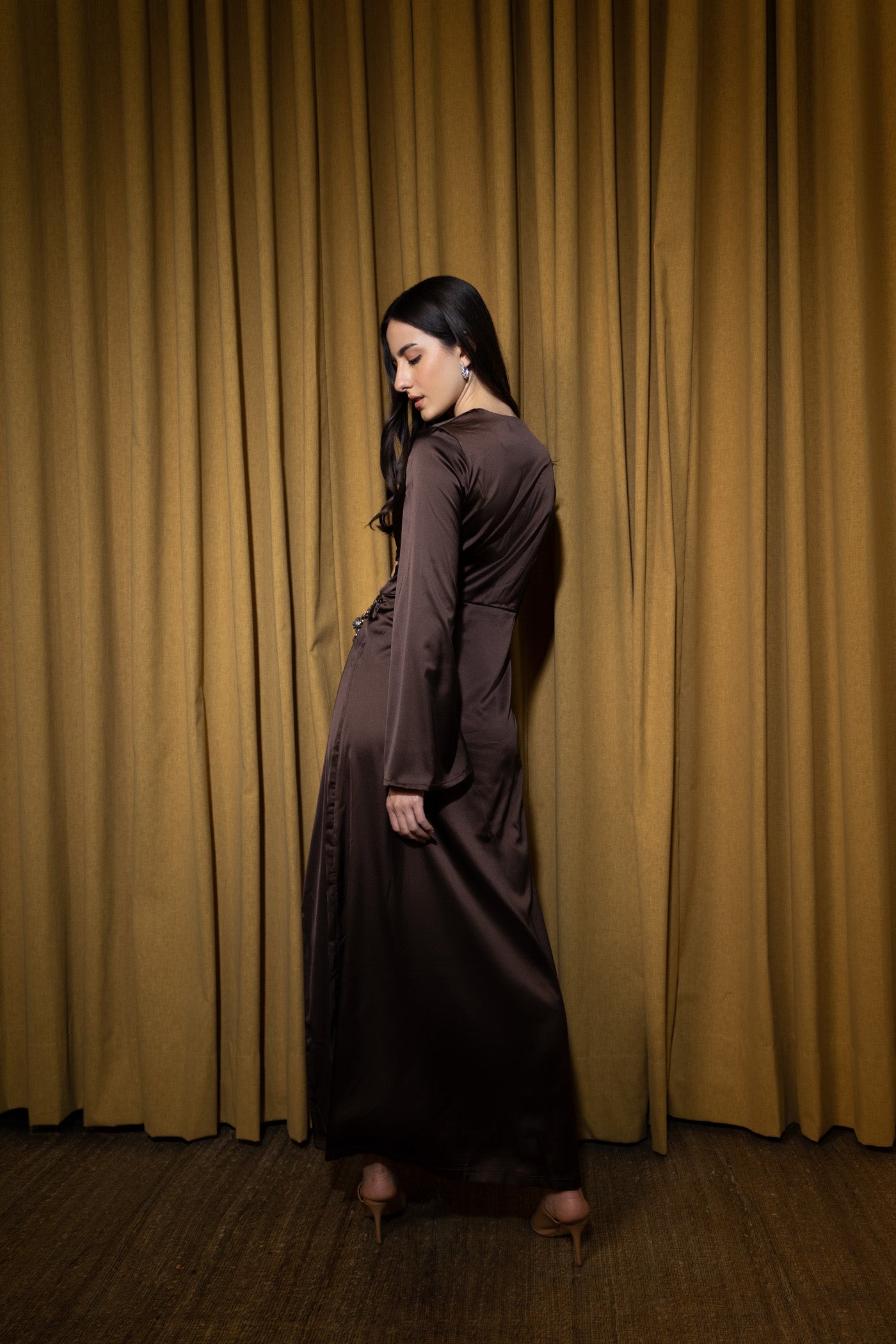 A vision of elegance in rich dark brown satin. This long dress features a side-long slit and a unique side slit around the waist, offering a hint of allure with every step. Adorned with a crystal-embellished tan lambskin leather chain belt, a flattering V neckline, and elegant bell sleeves, perfect for making a statement formally