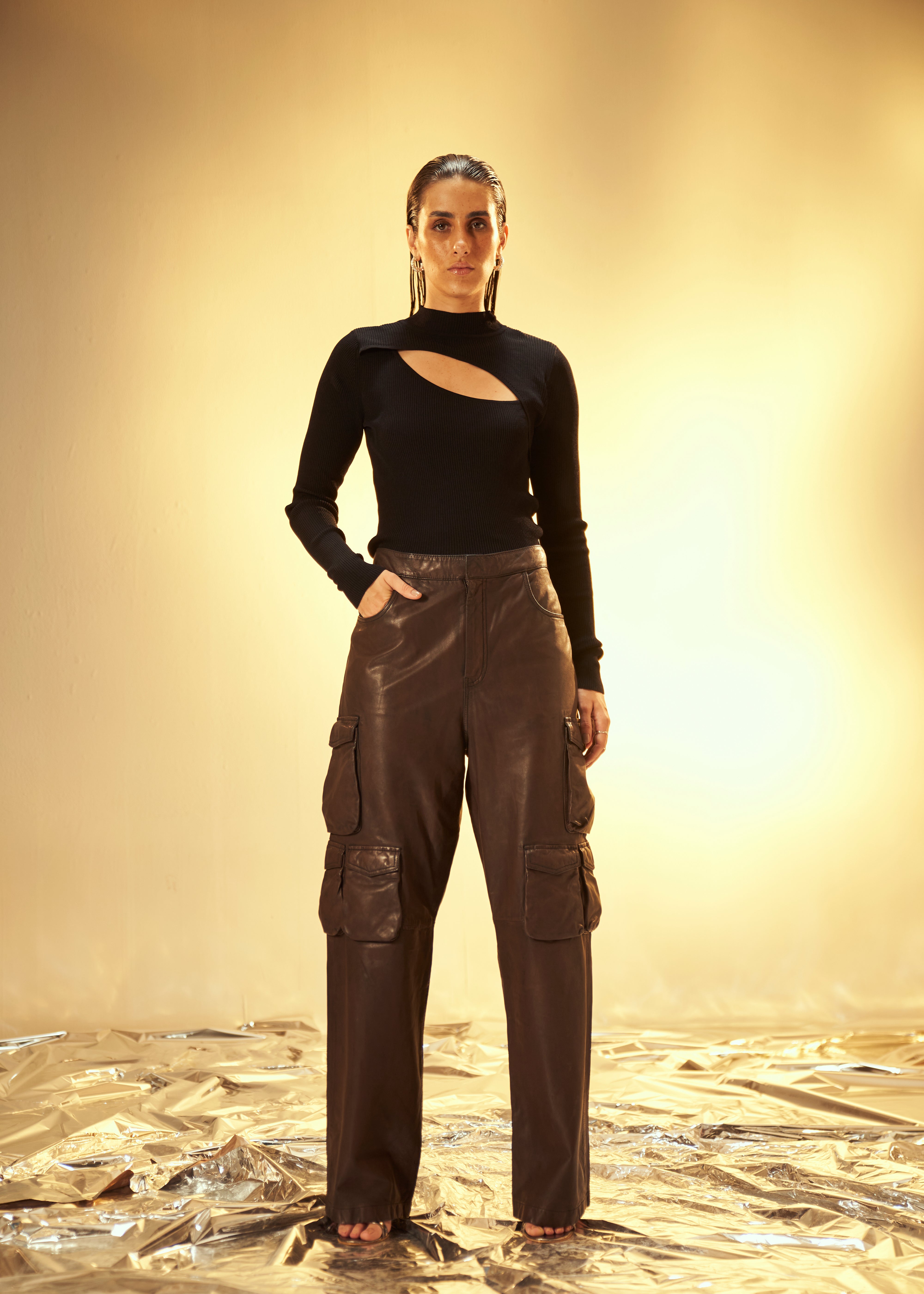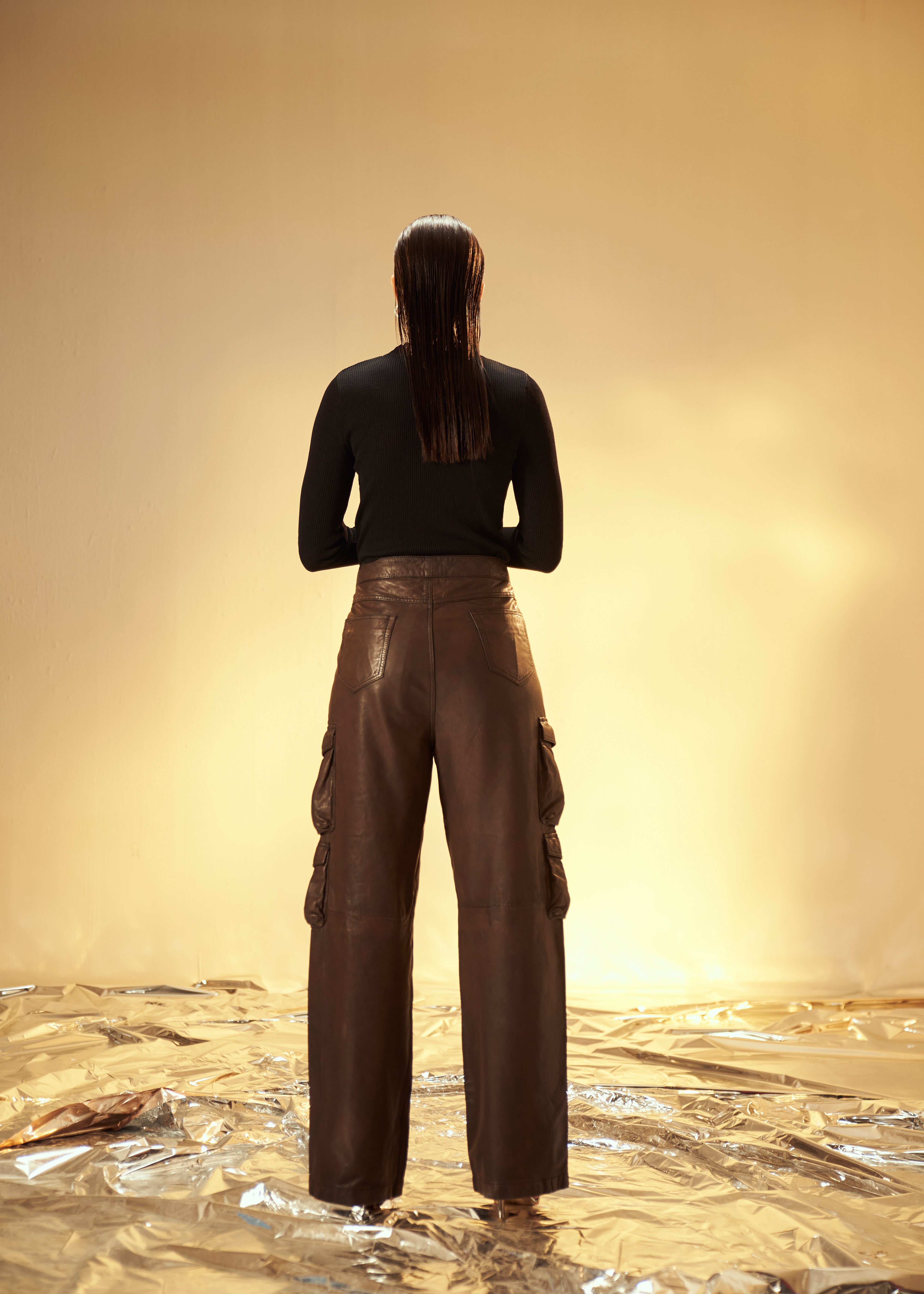 Payal Sen in Argento Leather Cargos