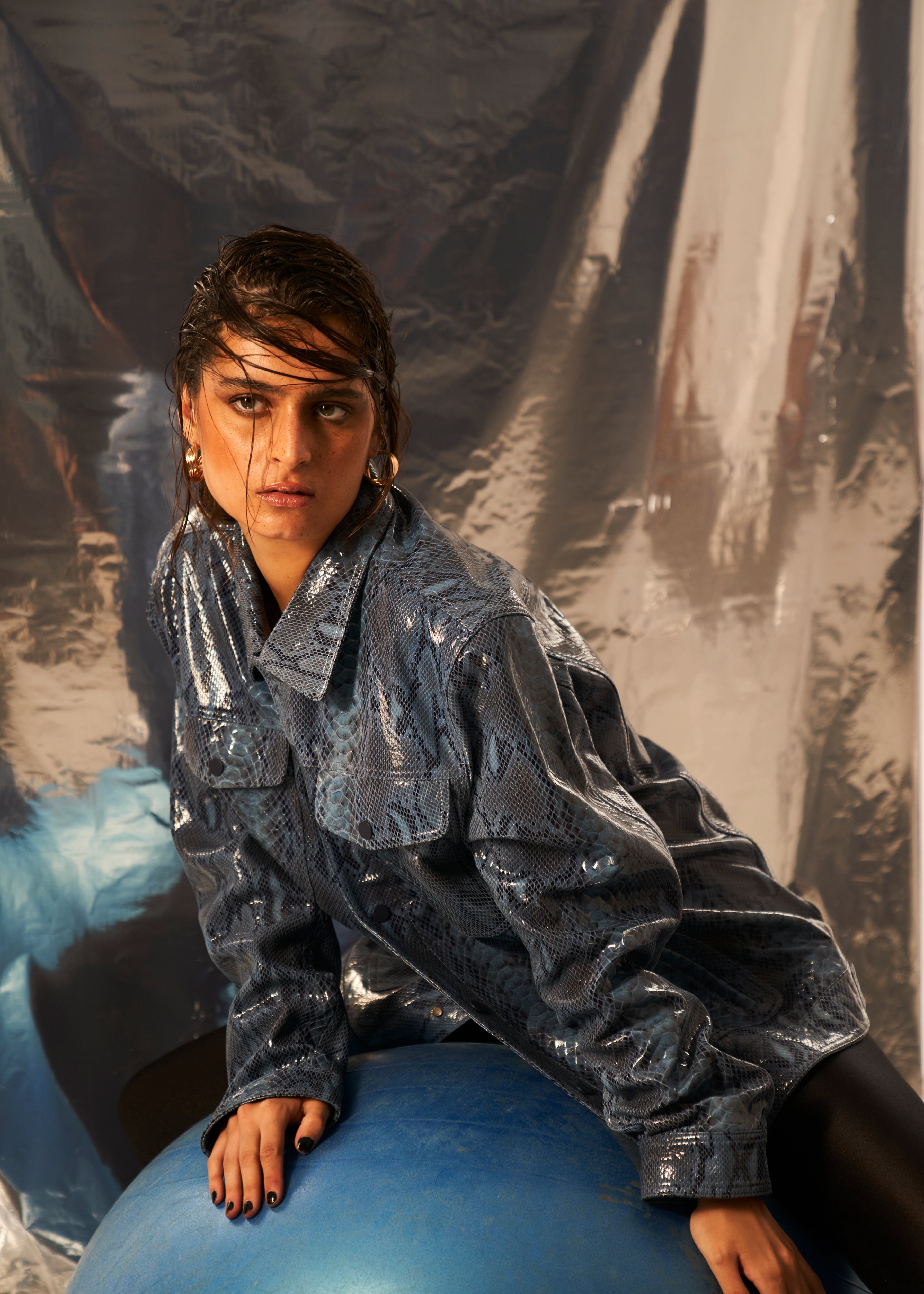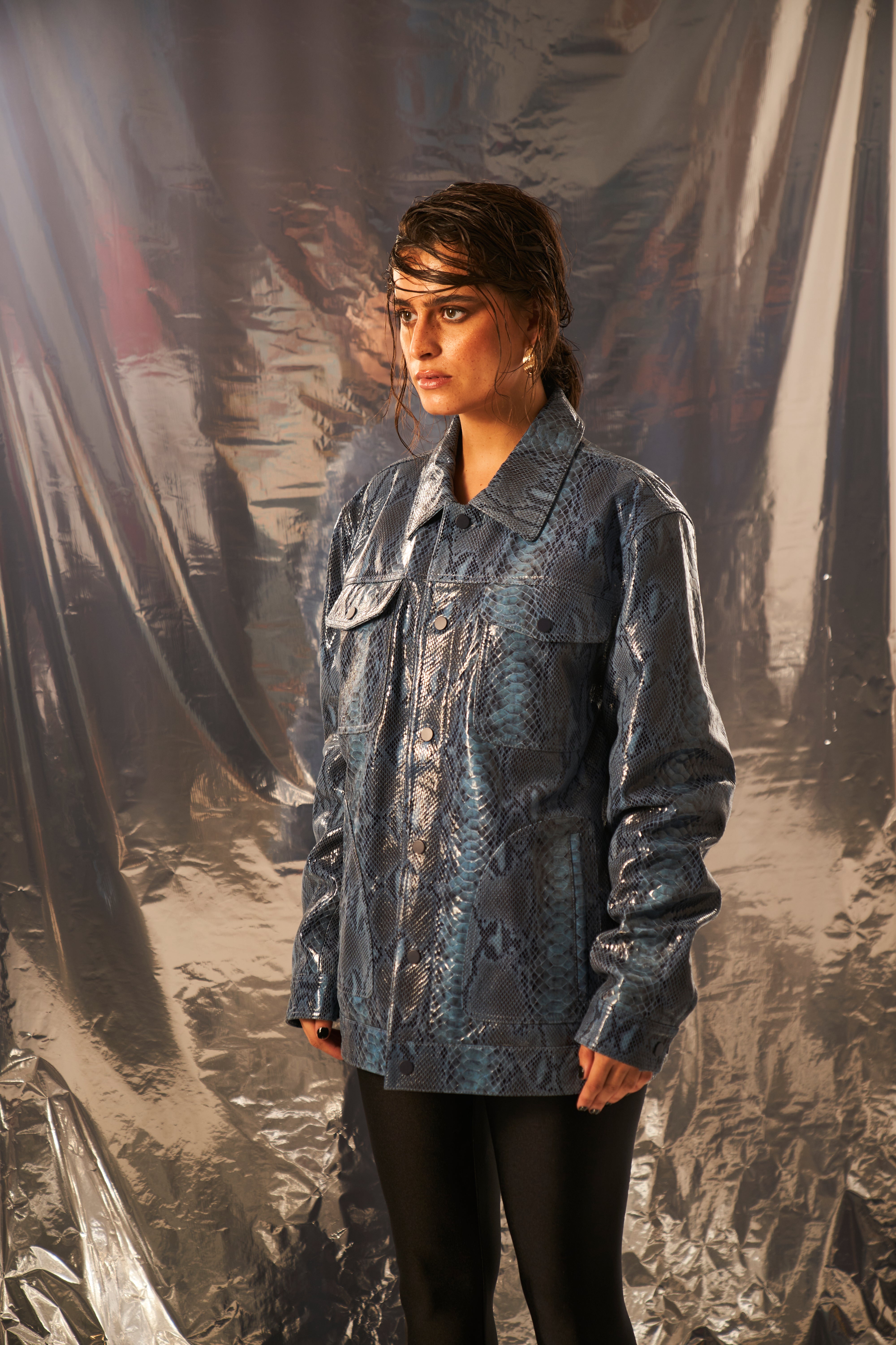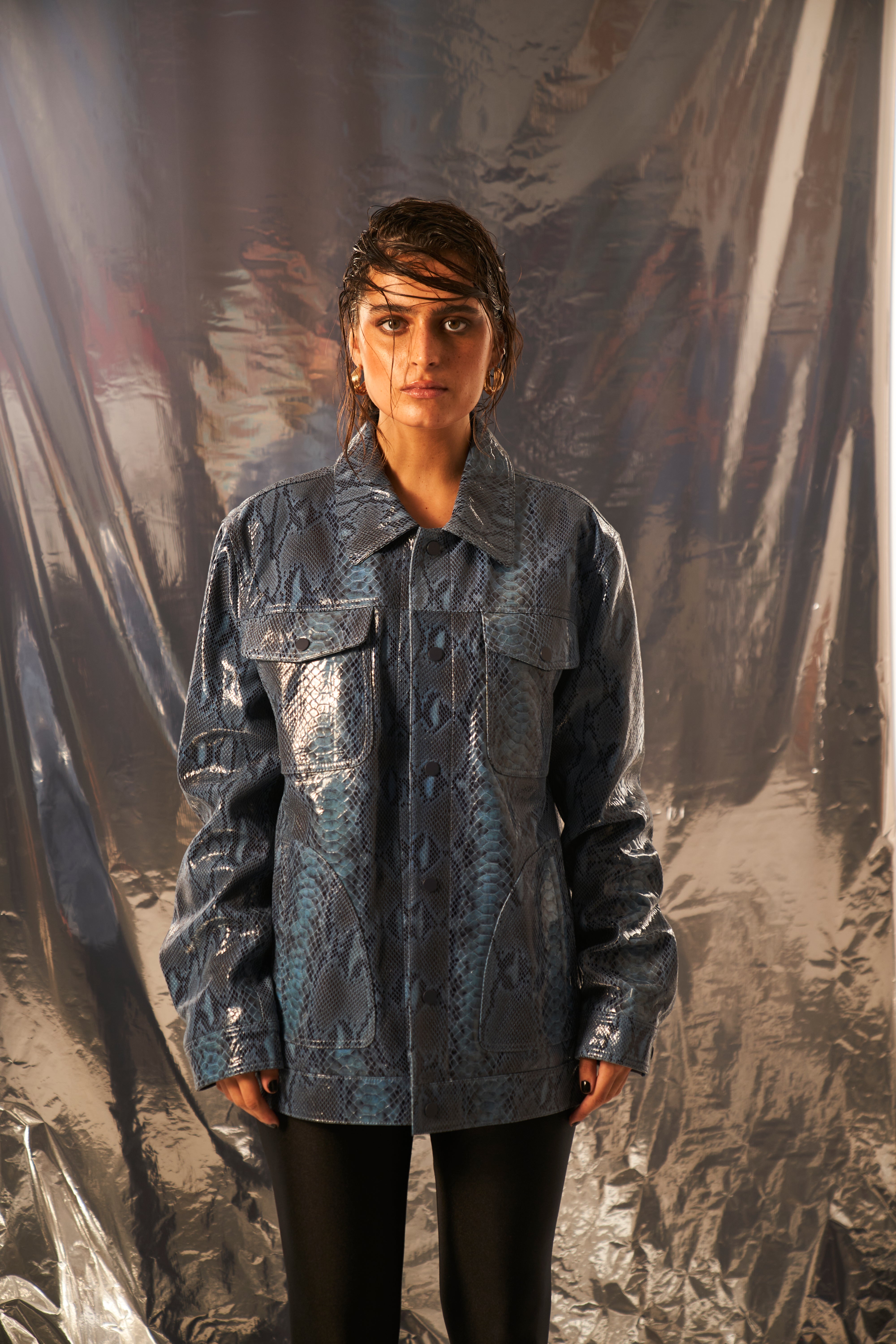 Nikita Vasudev in Unisex Snakeskin Pattern Leather Jacket