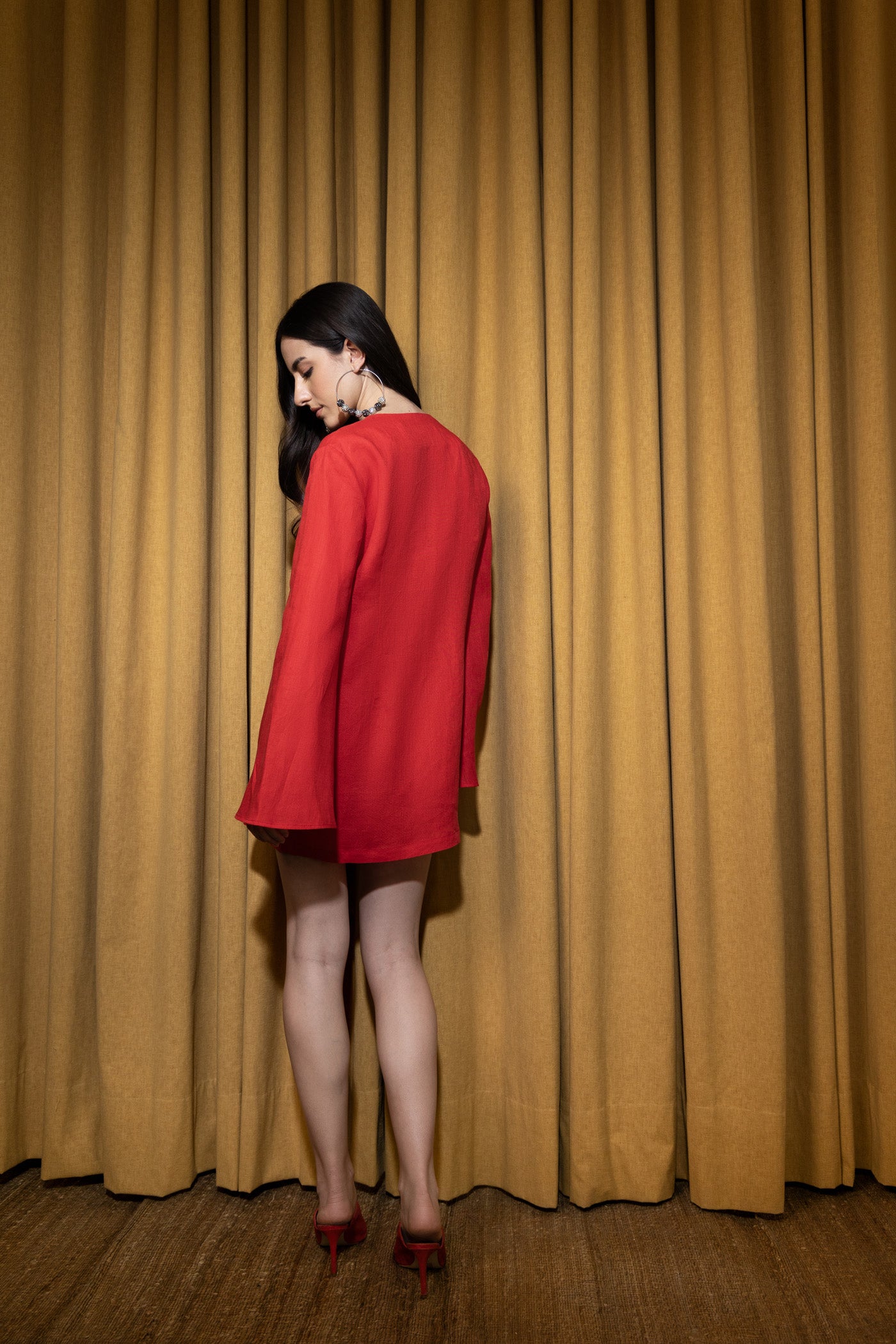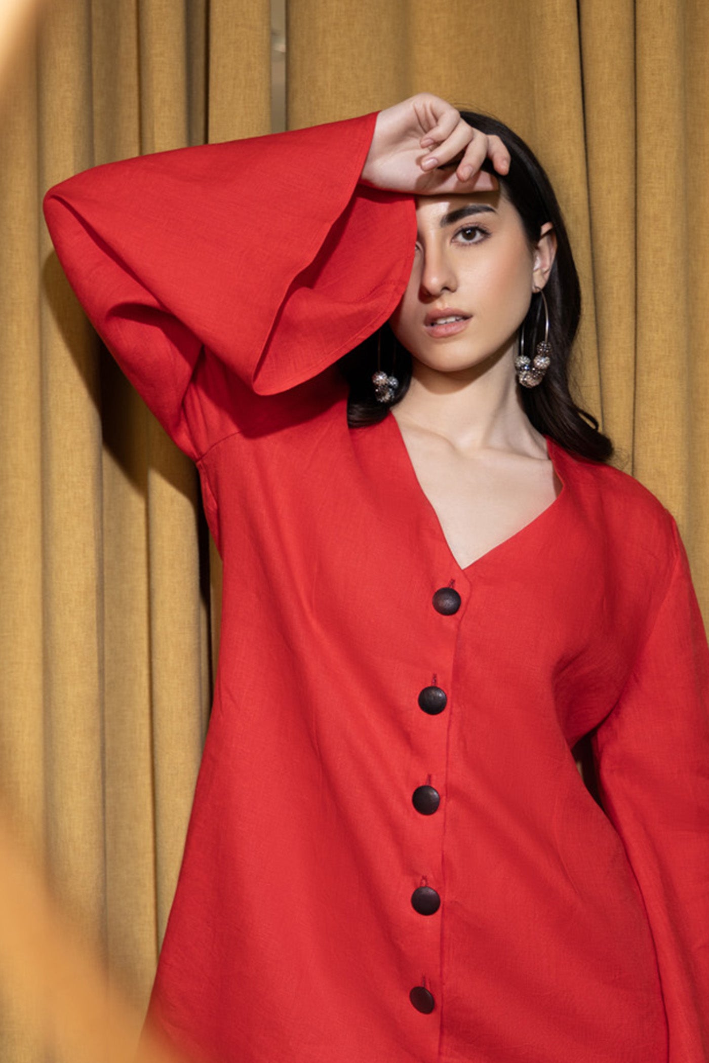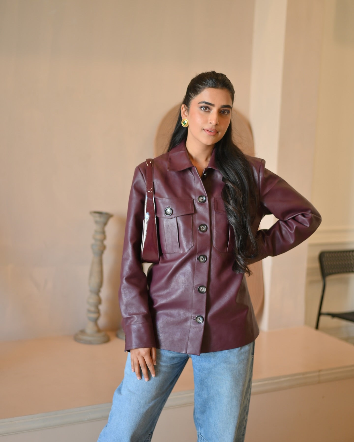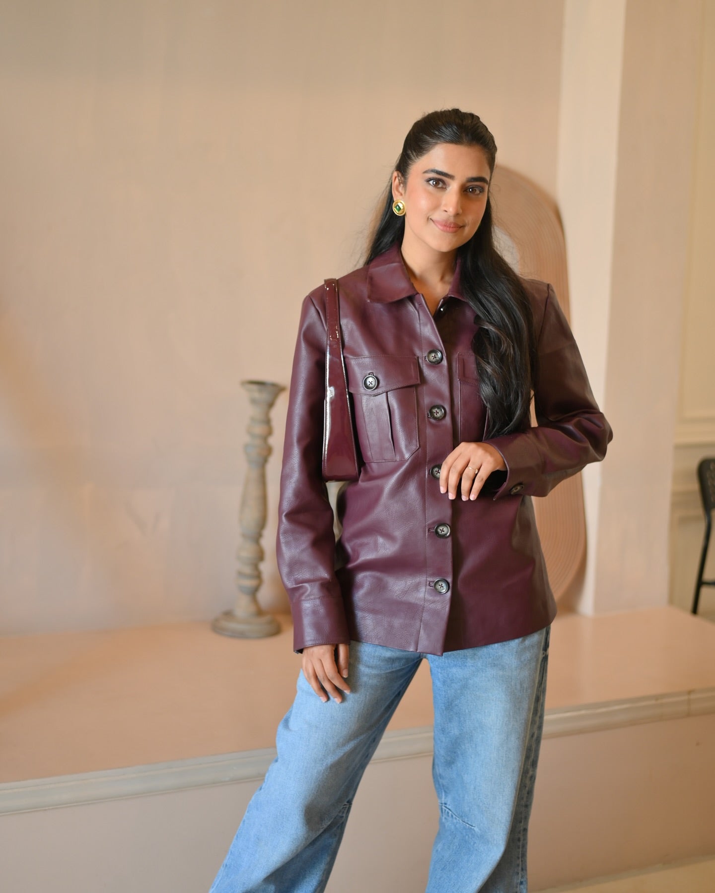 Bhavdeep Kaur in Burgundy Timeless Leather Shirt