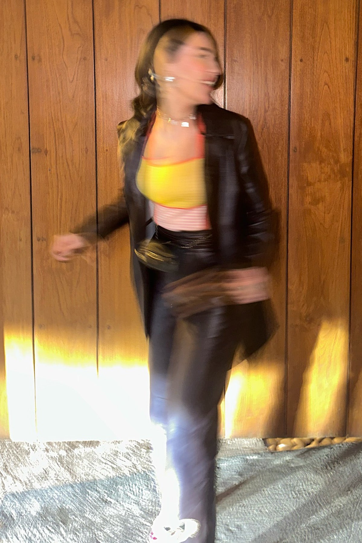 Payal Sen in Amber Leather Trenchcoat