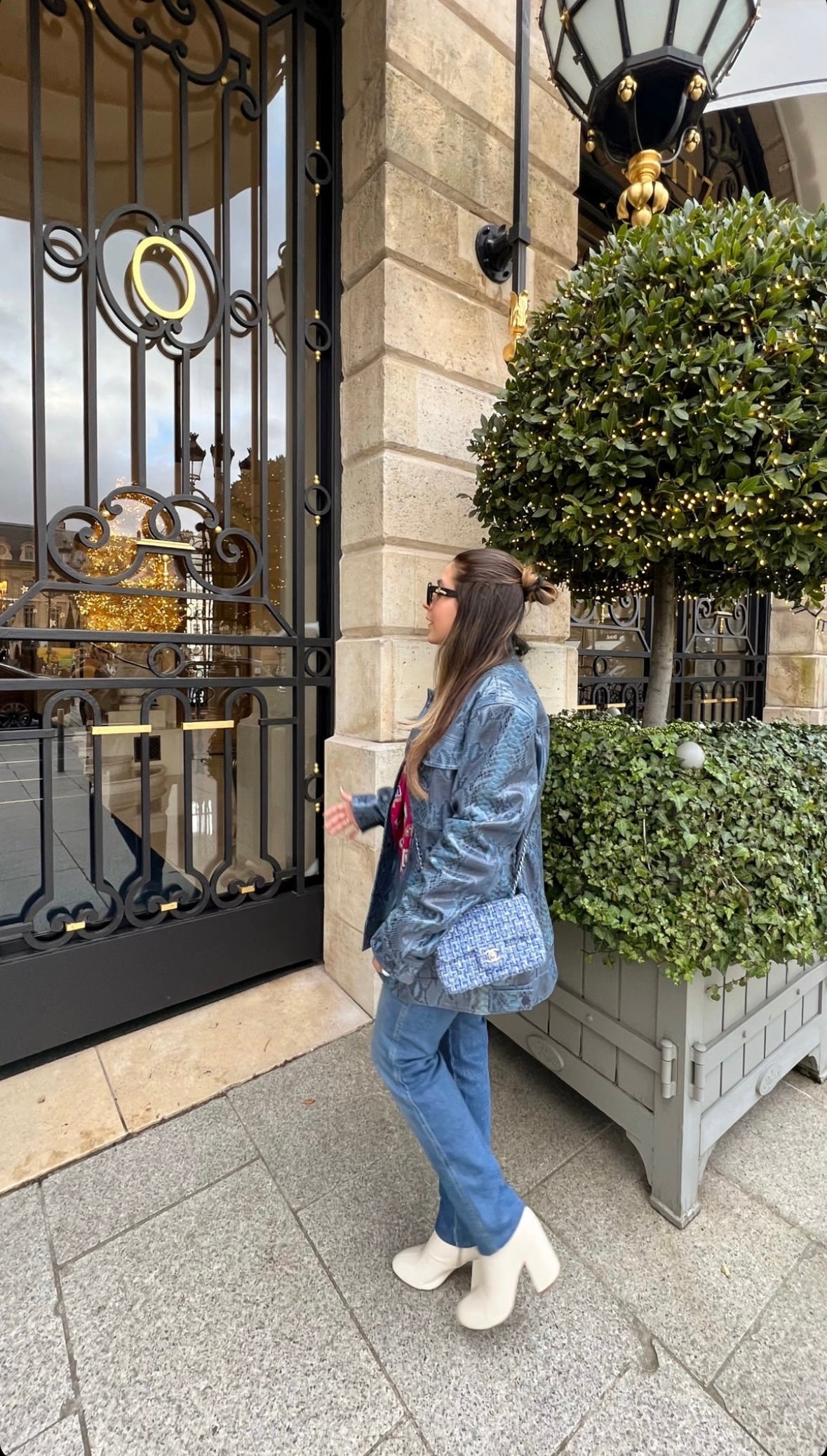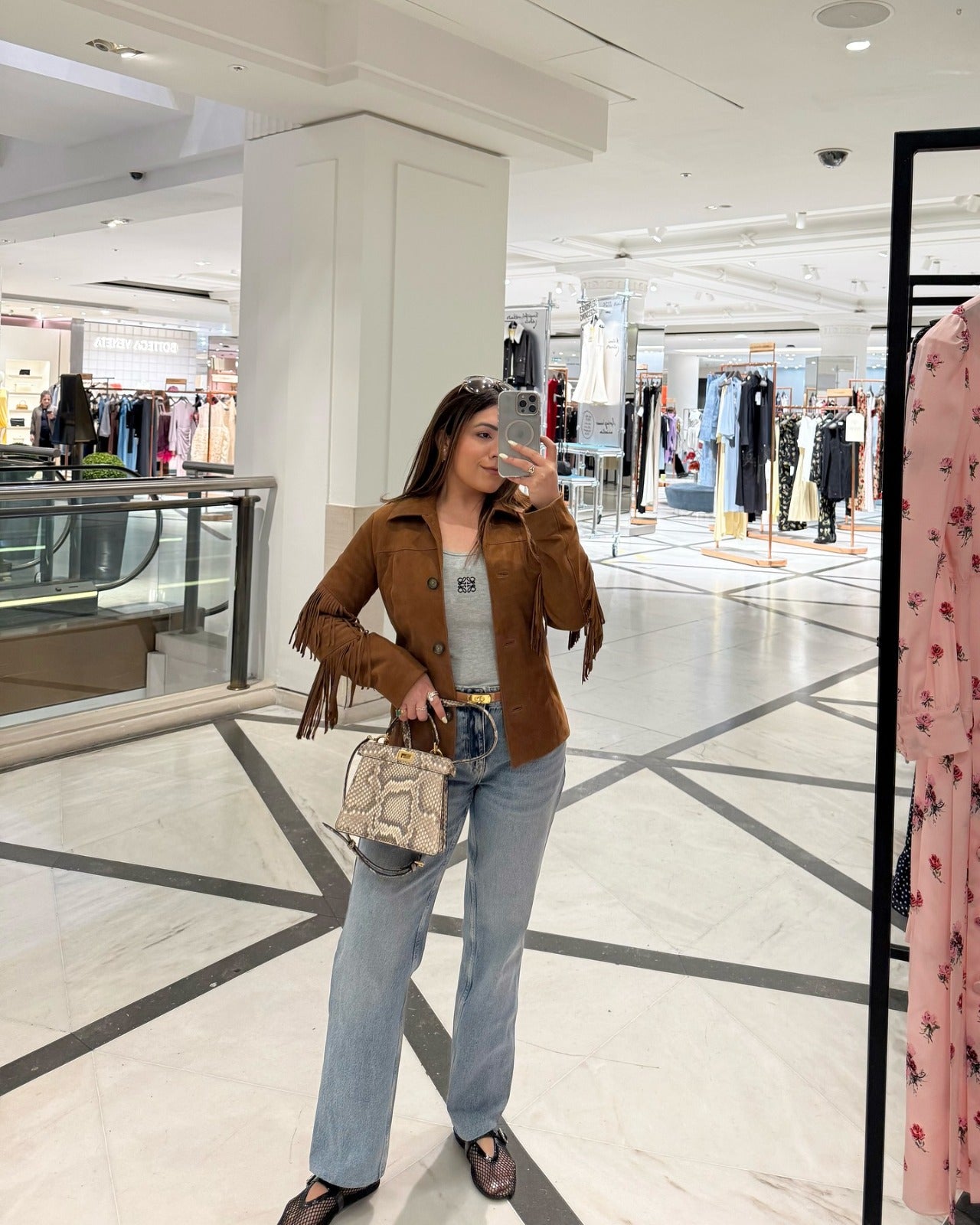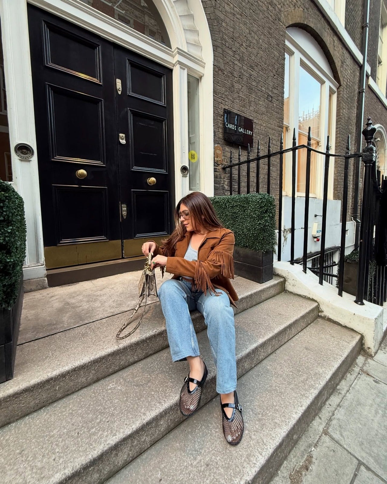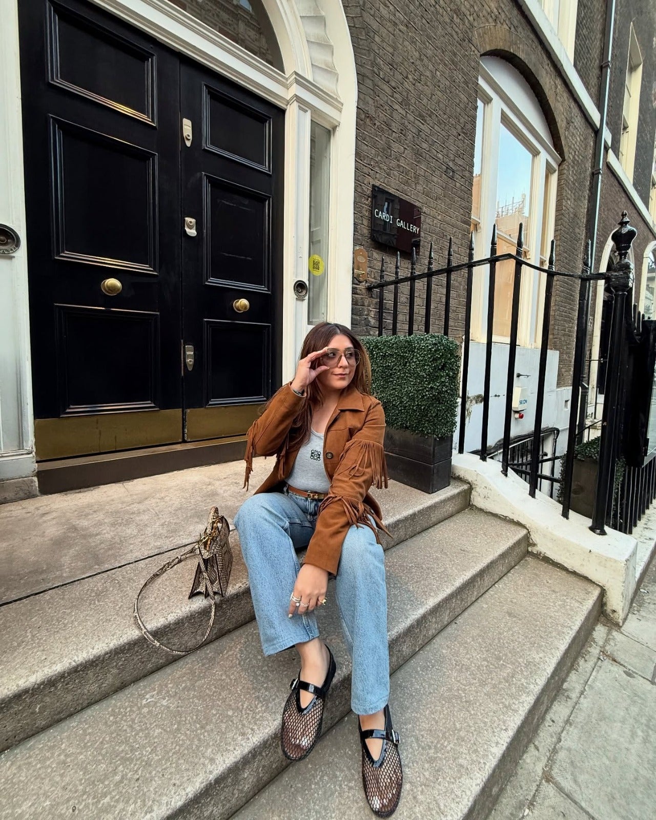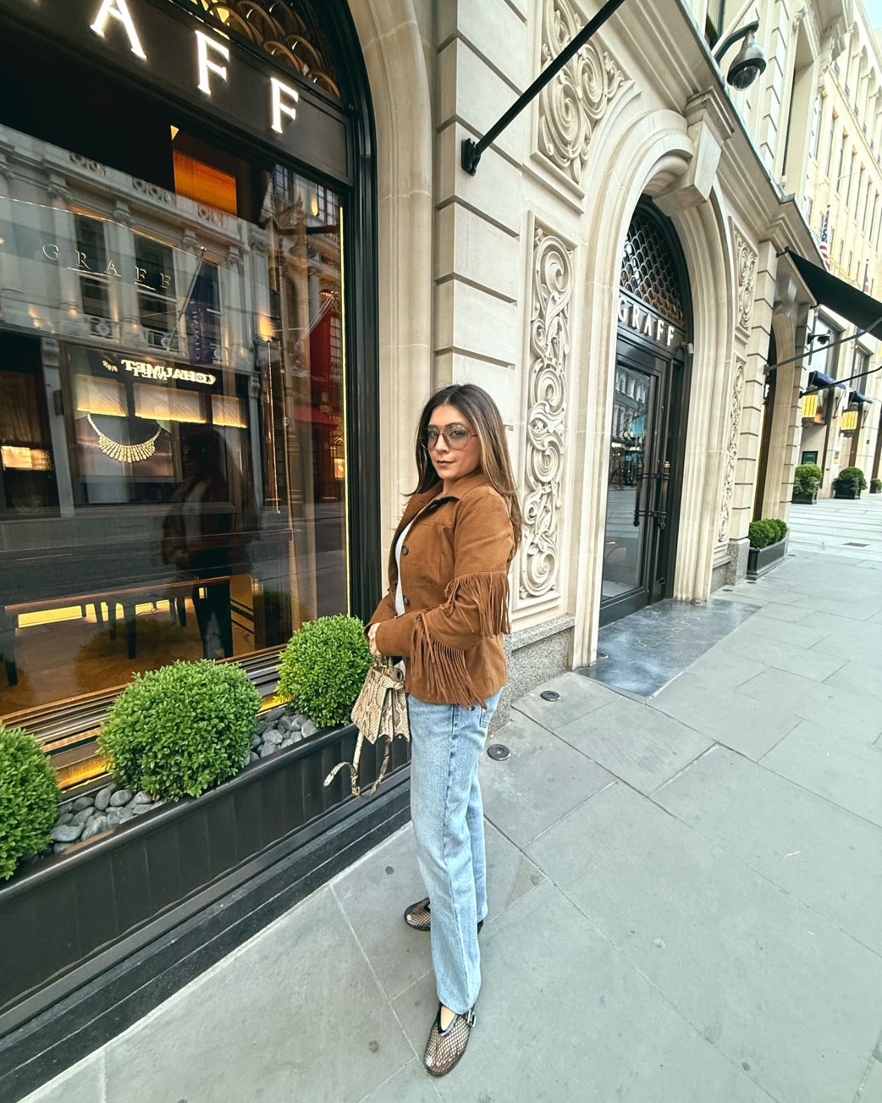 Nikita Vasdev in Olivea suede jacket