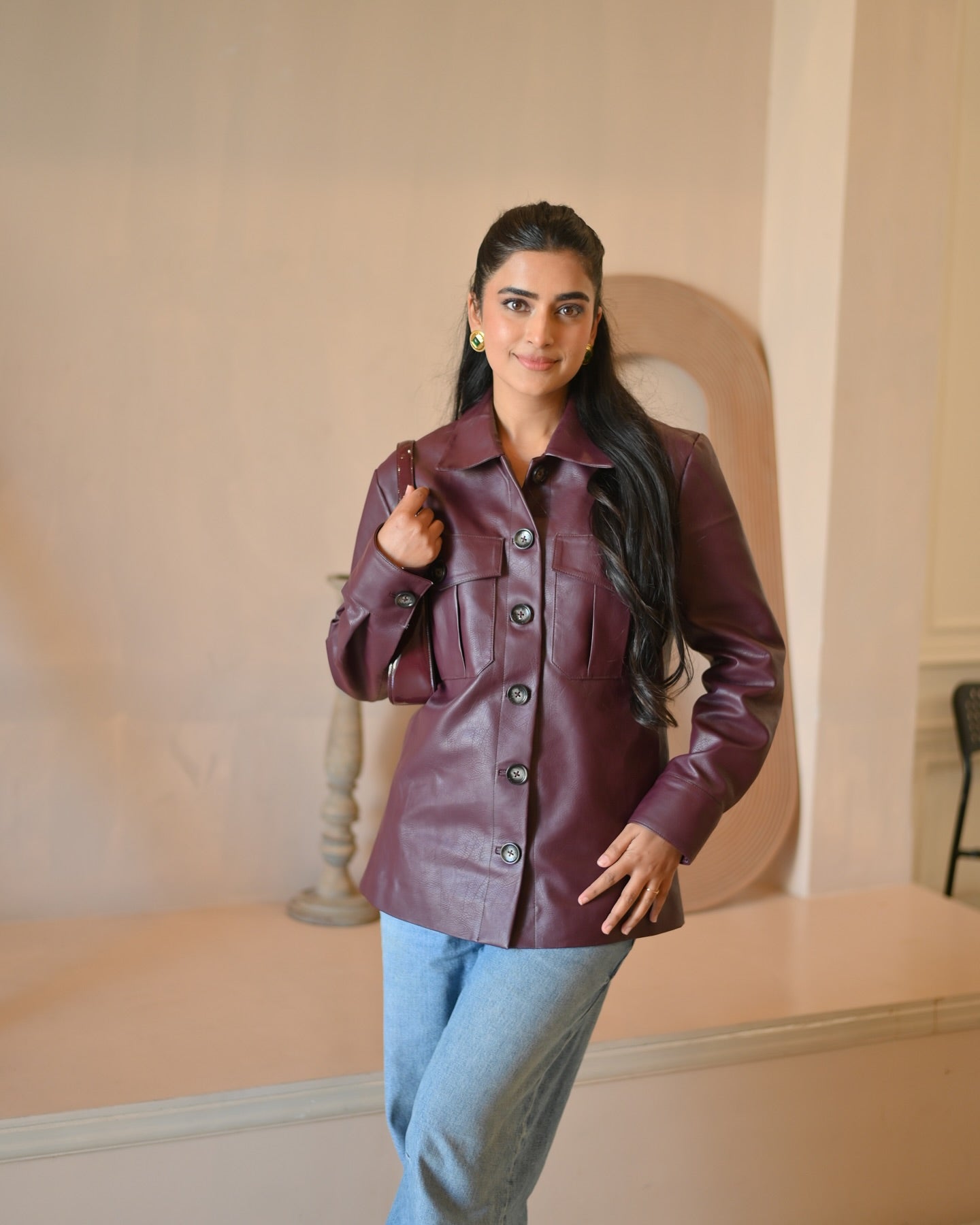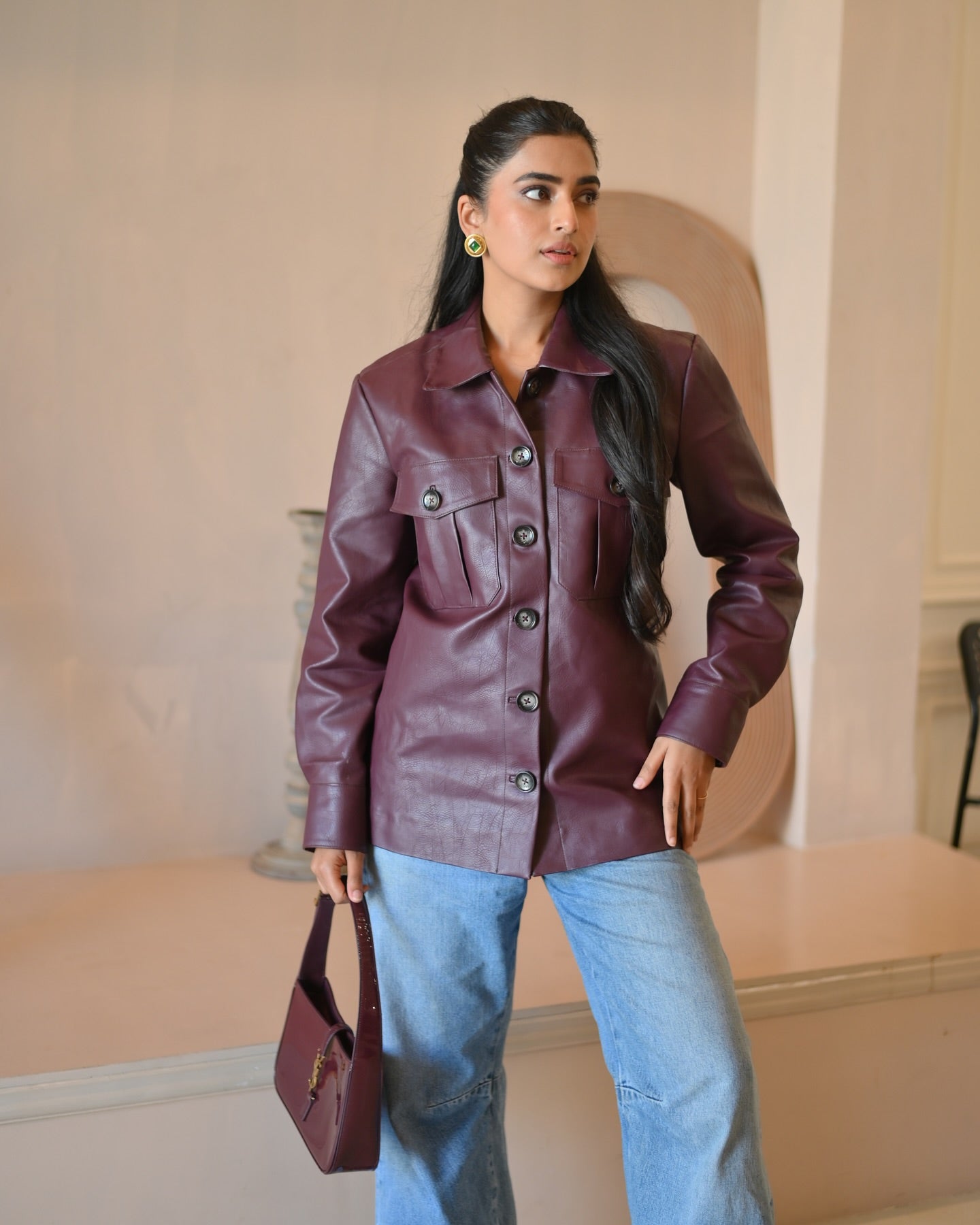 Bhavdeep Kaur in Burgundy Timeless Leather Shirt