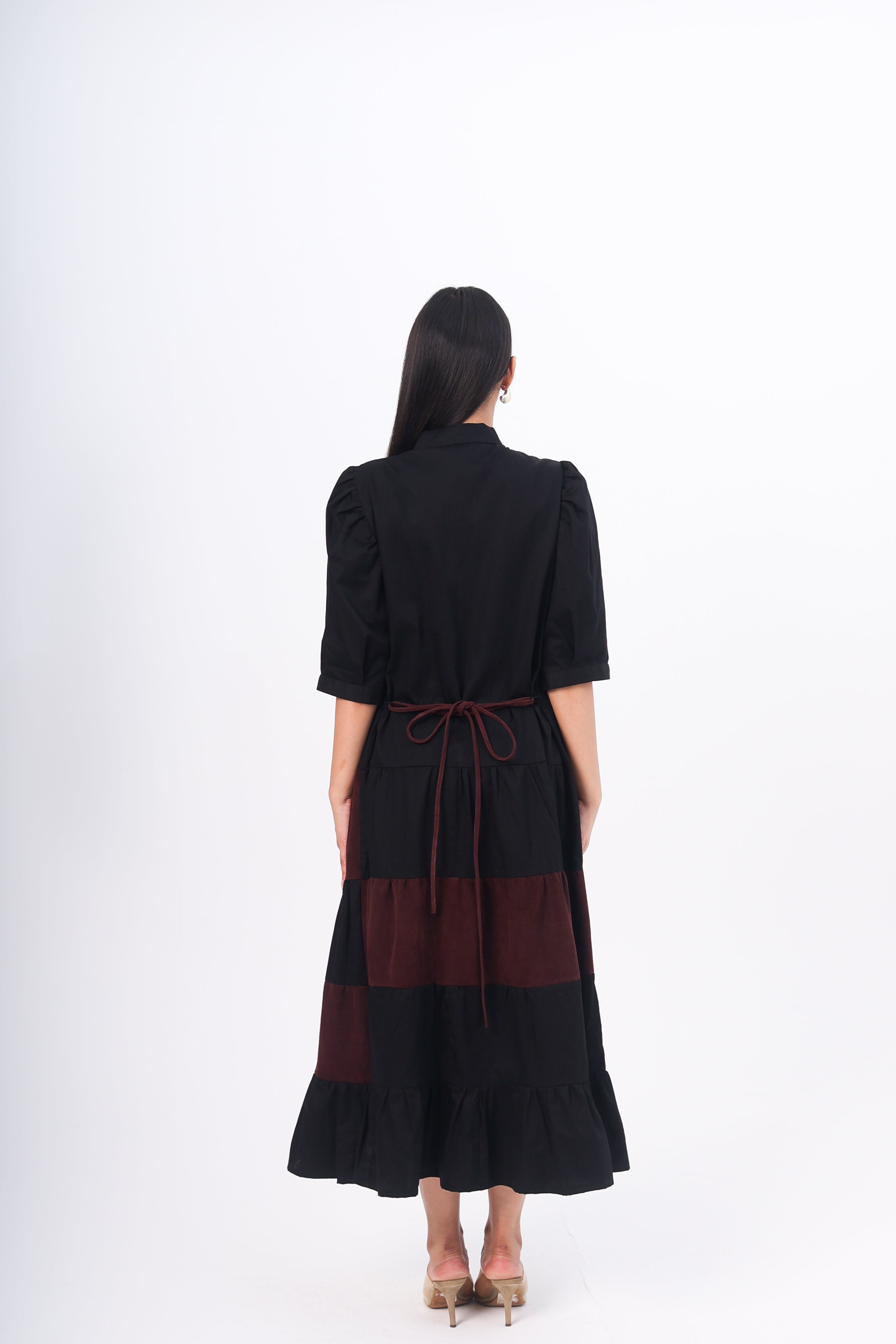 Sangria Dress is crafted in black glazed cotton with rich burgundy suede panels, this button-down midi features soft puff sleeves, a gathered skirt, and a matching suede belt for a cinched silhouette. Effortlessly elegant with a playful twist.