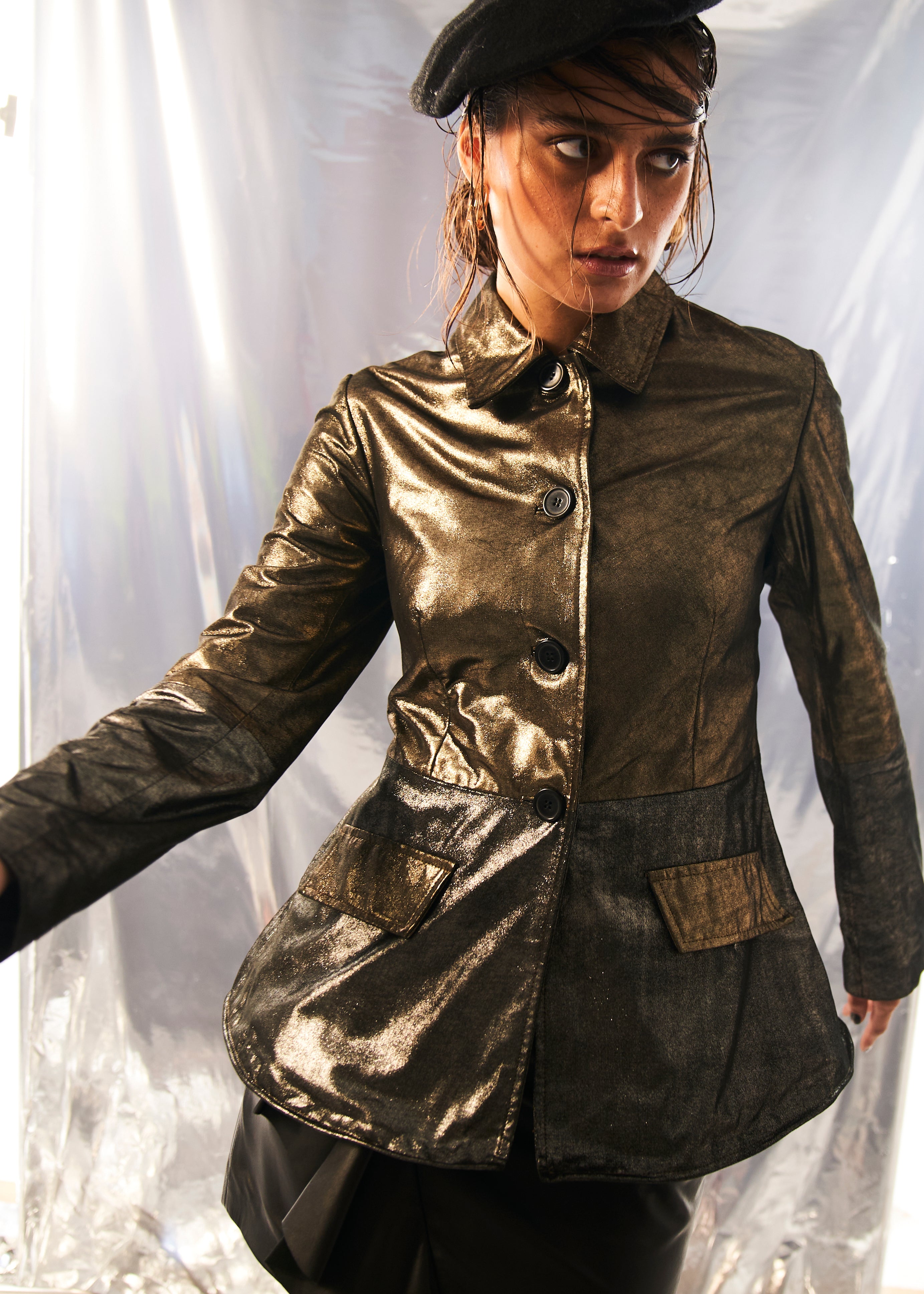 A stunning blend of sophistication and glamour. This peplum style blazer jacket features shiny gold and silver suede lambskin leather, creating a dynamic contrast. With contrasting flap pockets, black buttons, and a shirt collar, it's a statement piece that exudes modern elegance.