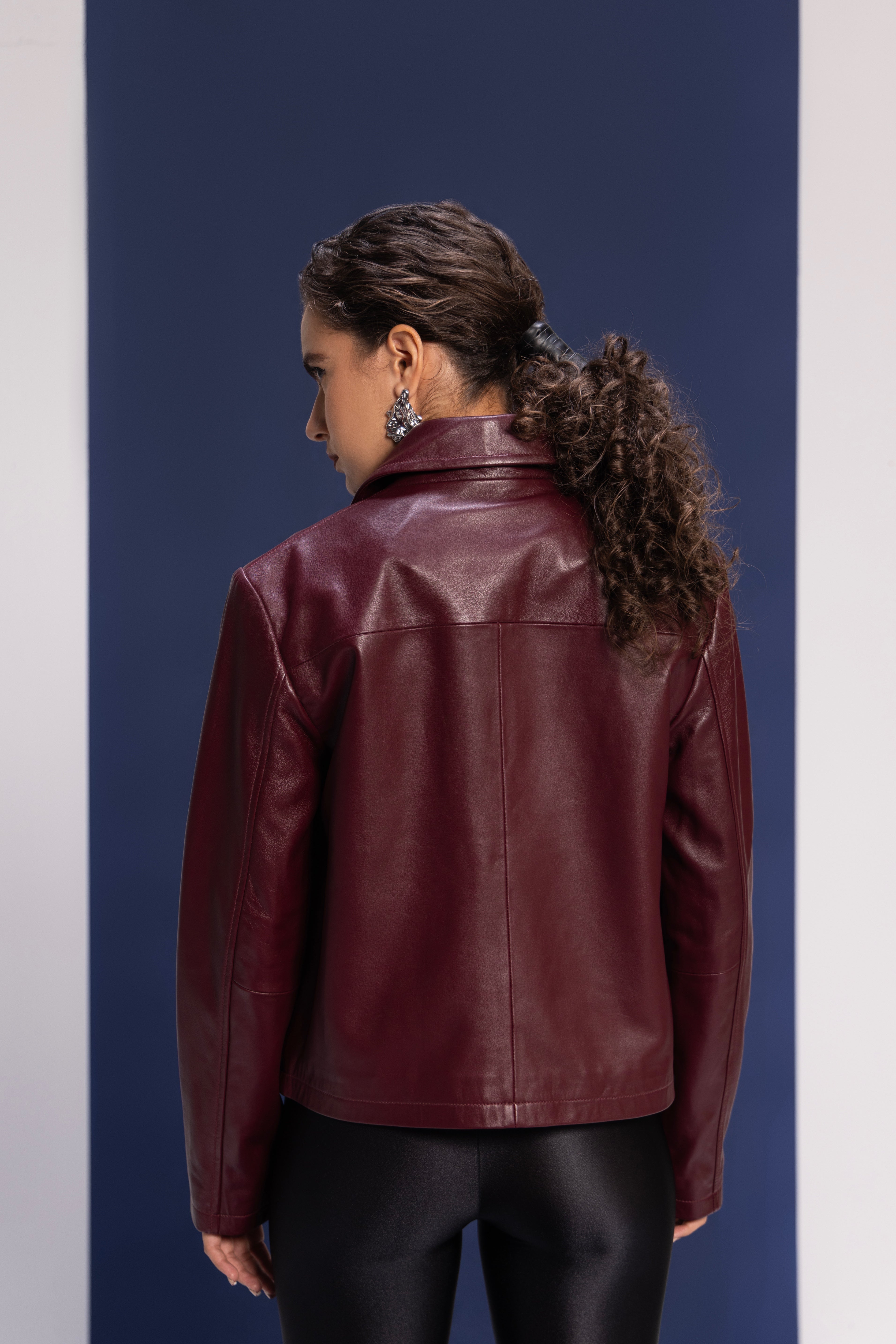 Rosso Leather Jacket exudes bold refinement in rich burgundy lambskin leather. Designed with metallic lock closures and four functional pockets, this short jacket brings structured luxury to modern dressing.